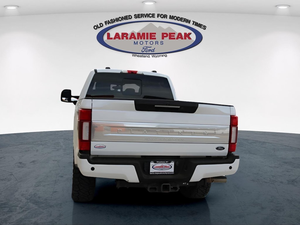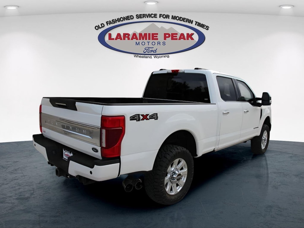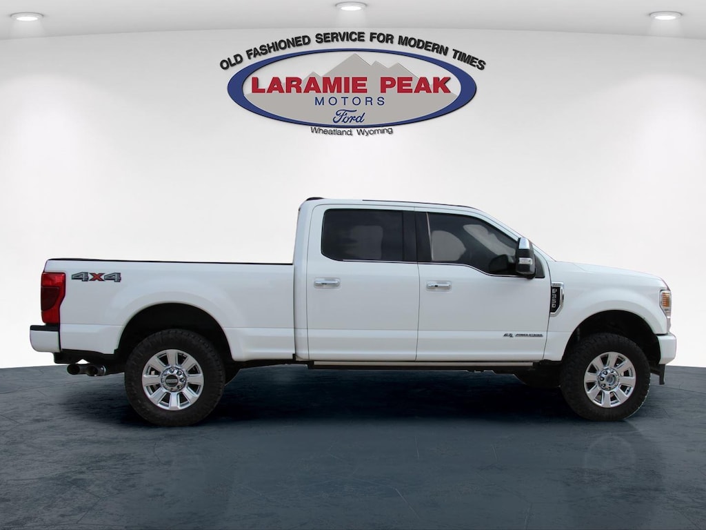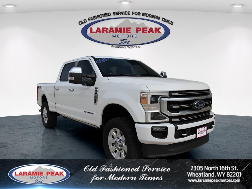 Experience the BEST customer service a Dealership can offer by looking at this 2020 Ford F-350SD Platinum in Star White Metallic Tri-Coat in Wheatland, WY with 82675 Miles - 1FT8W3BT0LEE54458. Serving Southeast Wyoming-- Casper, Cheyenne, Laramie, Douglas, and Torrington. This vehicle is available today at Laramie Peak Motors. Call 3073222355 to speak with one of our Sales Professionals NOW!2020 Ford F-350SD Platinum 4D Crew Cab, Power Stroke 6.7L V8 DI 32V OHV Turbodiesel, 10-Speed Automatic, 4WD, Black w/Unique Platinum Leather 40/Console/40 Seats, 10 Speakers, 110V/400W Outlet, 34 Gallon Fuel Tank, 397 Amp Alternators, 4-Wheel Disc Brakes, ABS brakes, Adjustable pedals, Air Conditioning, Alloy wheels, AM/FM radio: SiriusXM, Auto High-beam Headlights, Auto-dimming Rear-View mirror, Automatic temperature control, Brake assist, Compass, Delay-off headlights, Driver door bin, Driver vanity mirror, Dual front impact airbags, Dual front side impact airbags, Electronic Stability Control, Electronic-Locking w/3.55 Axle Ratio, Exterior Parking Camera Rear, Flow-Through Console, Front Bucket Seats, Front Center Armrest, Front dual zone A/C, Front fog lights, Front reading lights, Fully automatic headlights, GVWR: 11,400 lb Payload Package (68L), Heated door mirrors, Illuminated entry, Leather steering wheel, Low tire pressure warning, Order Code 713A, Outside temperature display, Overhead console, Panic alarm, Passenger door bin, Passenger vanity mirror, Power door mirrors, Power driver seat, Power passenger seat, Power steering, Power windows, Radio data system, Radio: B&O System by Bang & Olufsen, Rear Parking Sensors, Rear reading lights, Rear seat center armrest, Rear step bumper, Rear window defroster, Remote keyless entry, Security system, SiriusXM Radio, Snow Plow Prep Package, Speed control, Split folding rear seat, Steering wheel mounted audio controls, SYNC 3 Communications & Entertainment System, Tachometer, Telescoping steering wheel, Tilt steering wheel, Tough Bed Spray-In Bedliner, Traction control, Trip computer, Turn signal indicator mirrors, Variably intermittent wipers.Odometer is 7305 miles below market average!Sales Tax, Title, License Fee, Registration Fee, Dealer Documentation Fee $349, Finance Charges, Emission Testing Fees and Compliance Fees are additional to the advertised price.